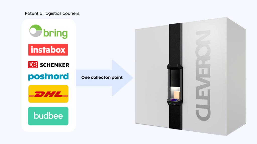 To explain the idea easily, here’s an image illustrating what retail-driven open network entails. Instead of having separate parcel machines for each third-party courier and them having separate customer journeys, you can integrate all into one parcel solution, in this case, in Cleveron 402.